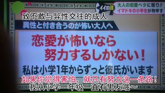 @小野妹子学吐槽:日本电视台拍摄了一期名为《现在的大人太不会谈恋爱了!让我们小学生教你们!》的节目,请到小学恋爱达人分享经验,帮助懦弱的成年人勇敢去爱……受访小学生大多情史丰富,从一年级就没闲过,有的是发消息搞定男神,有的是地上出现神奇图案,最牛的女孩已经谈过7个……感觉自己只配回幼儿园了