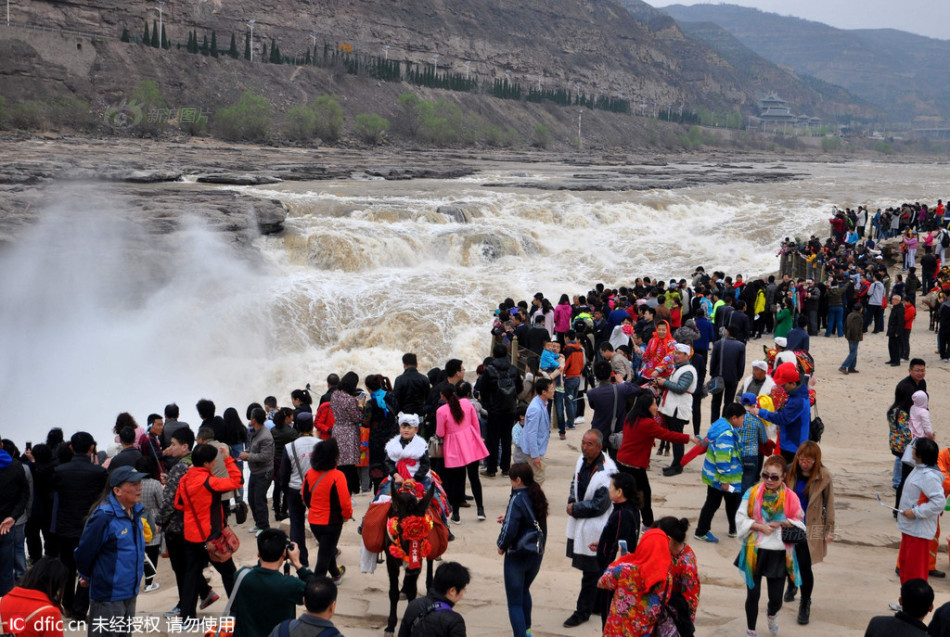 2016年4月3日,众多游客在山西吉县黄河壶口瀑布景区游览观瀑布。