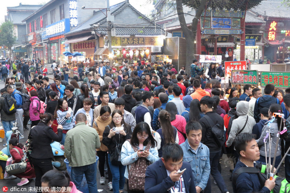 2016年4月3日,西安回民街景区游人如织。当日是清明小长假的第二天,西安回民街各种特色小吃吸引着来自五湖四海的游客品尝,人山人海,摩肩接踵,人满为患。