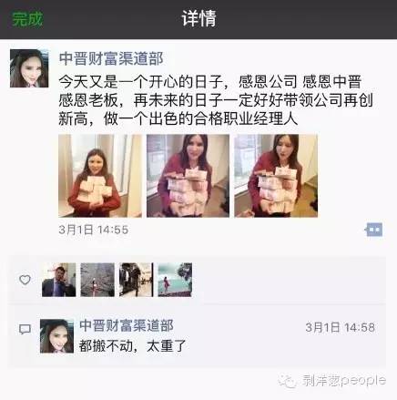 3月1日,她又晒出手捧七八捆百元钞票的图片,配文“感恩公司 感恩中晋 感恩老板,在未来的日子里一定好好带领公司创新高,做一个出色的合格职业经理人”。