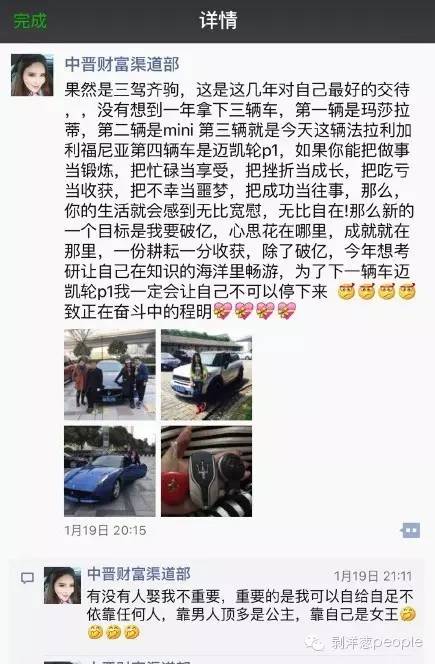 两个月后,她又在朋友圈晒自己拥有了三辆豪车,分别是玛莎拉蒂、mini和法拉利,还准备买第四辆迈凯轮P1。