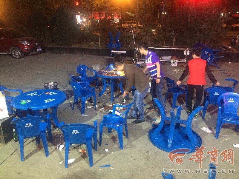 4月10日晚8点左右,饭店门口已经有3桌,共20多名食客在吃烤肉。饭店监控显示,1名身穿黑色外套的年轻男子,带着 4名身穿白色短袖的男子,手持木棍,自南向北来到烤肉摊,直接对食客的桌子开始打砸,食客在受到惊吓后纷纷跑开,破碎的桌椅和饭菜散落一地。监控记录,5 名男子分工明确,只打砸桌椅等物品,未伤及到食客和服务员。有的服务员还没反应过来,面前的烤肉炉就被砸翻在地,冒出熊熊火光。整个打砸过程持续了约半分 钟,5名男子在将餐桌和桌子破坏后,直接向南逃跑,中间没有任何交流。因受到惊吓,王先生安排部分服务员提前下班,回家休息,食客们也纷纷散去。随后,王 先生向公安未央分局谭家派出所报了案。目前,出警民警已将监控调走,事件还在进一步调查中。