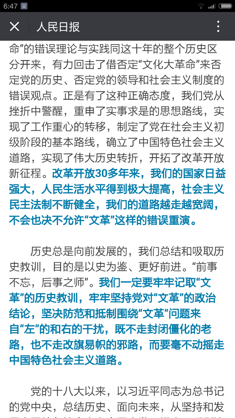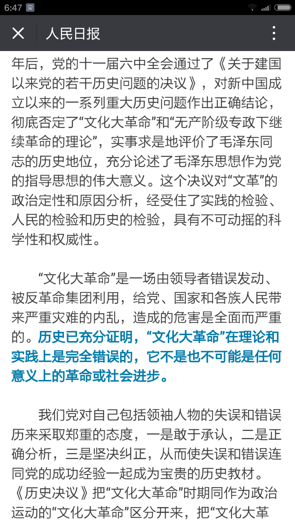 【人民日报:决不允许“文革”错误重演】“文化大革命”是一场由领导者错误发动、被反革命集团利用,给党、国家和各族人民带来严重灾难的内乱,造成的危害是全面而严重的。历史已充分证明,“文化大革命”在理论和实践上是完全错误的,它不是也不可能是任何意义上的革命或社会进步。
