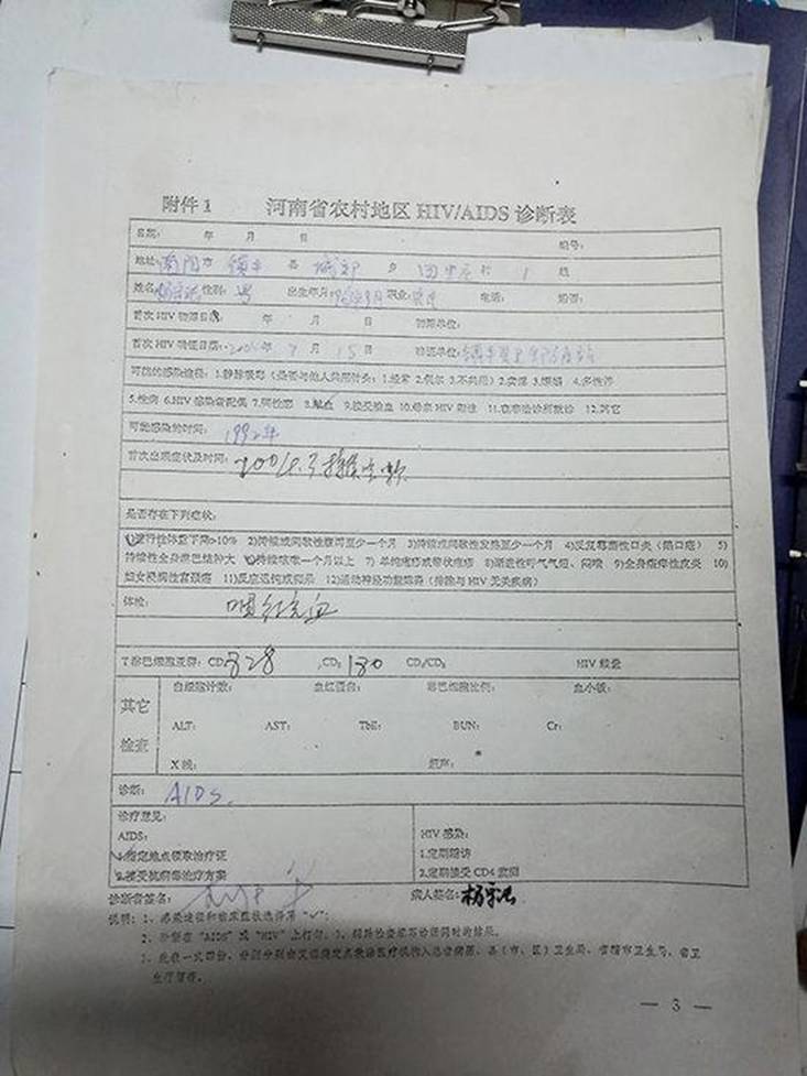 一份《河南省农村地区HIV/AIDS诊断表》显示,杨守法可能感染途径为"献血",可能感染时间为"1992年"。杨守法回忆,那时因超生被罚款,家里经济紧张,他卖过一次血,50元。"一次抽两大袋,太吓人,没敢再卖第二次。"