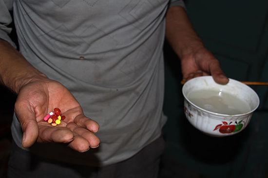 吃完饭,就着面条汤,他吃了一把药。