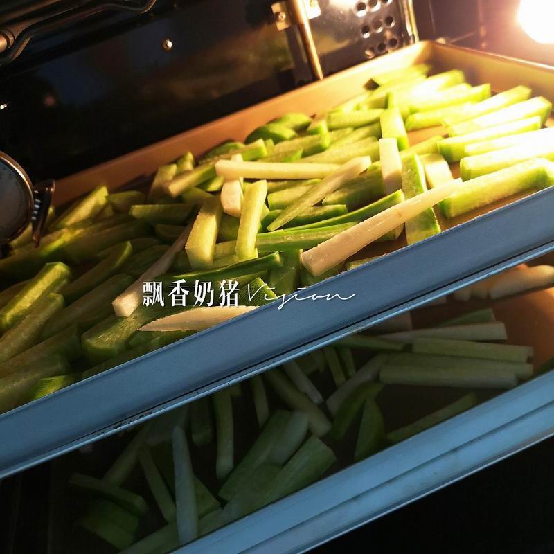 我们采取低温、慢烘的大原则,来做今天的萝卜干。烤箱预热100℃,然后放入烤盘,温度调到90℃,热风也打开(如有),热风调到95℃。