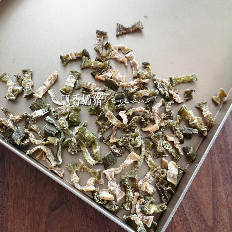 最后附一个图,在当天烘干后,我把剩下那些萝卜干扔厨房里一晚上。第二天威海终于放晴,天气也开始清爽了,萝卜干越来越干了。我把它们放密封袋里存起来,冰箱冷冻半年没问题,随吃随取。