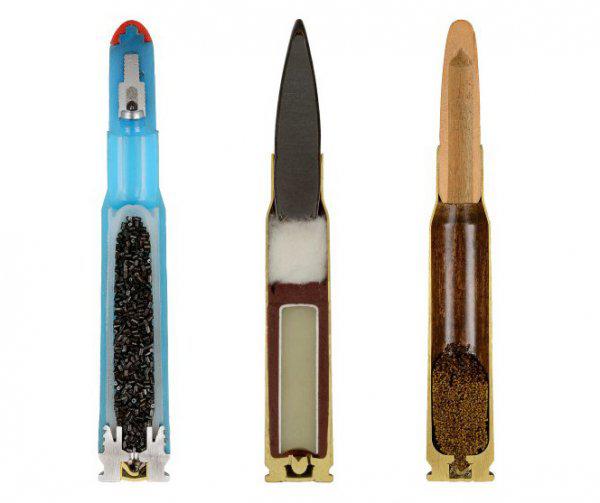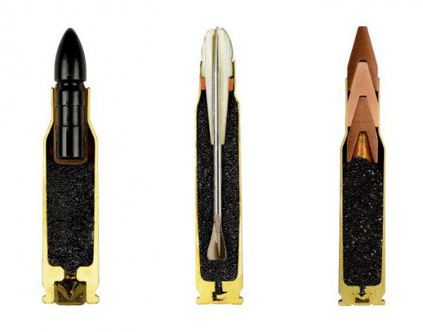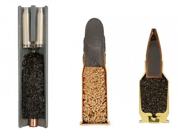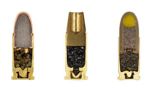 拍摄的截面显示,尽管武器技术一直随着时间的推移而发展,但是每一次革新子弹的基本结构不变。基本包括:一个弹头(子弹的顶部)、一部分燃料(通常是火药),以及底部的引物。扣动扳机时,金属撞针会撞击底部的引物,它会像导火线一样点燃料。随着燃料的燃烧,释放出大量气体,从而推动子弹以高速射出枪膛。
