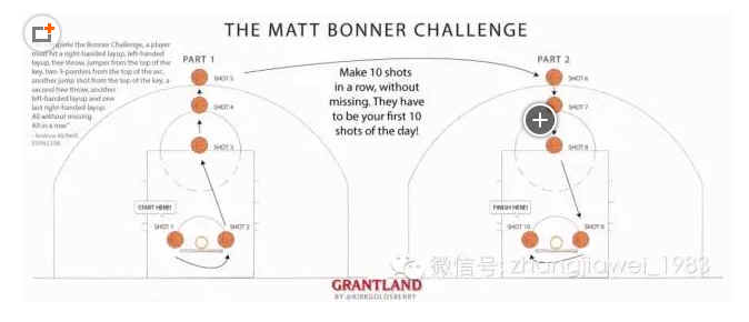 邦神是个训练场大咖。他有个投篮套路,每天早上开始训练时来一次,叫做邦纳挑战。按照下面的路线,连续10投全中,无一失手。