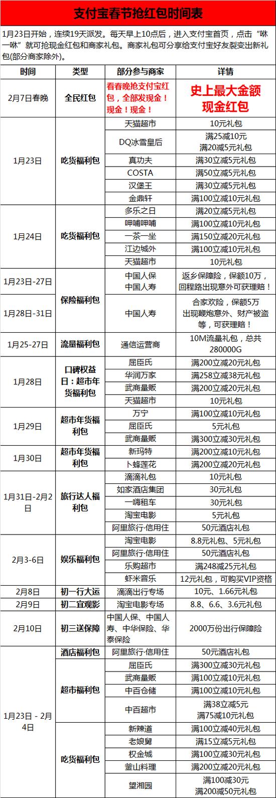 1月21日下午消息,支付宝今日公布“春节抢红包时间表”,1月23日开始,支付宝联合80家品牌商连续19天派发商家礼包。今年,支付宝成为了2016猴年央视春晚官方的唯一互动平台。2月7日春晚当天,用户在观看春晚的同时按照主持人提示打开支付宝“咻一咻”,完成相应任务就能平分大金额的春晚现金红包。
