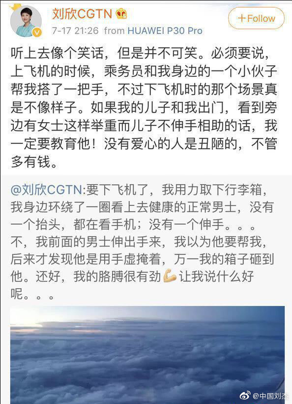 主播刘欣飞机上没人帮忙取行李吐糟:没爱心的人是丑陋的,不管多有钱。