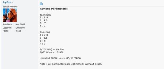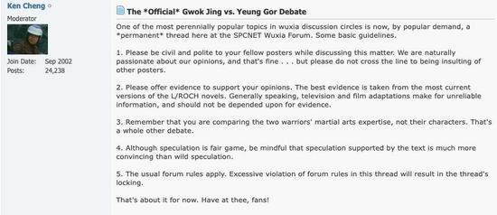 于是,版主诚恳( Ken Cheng )出来?发起了一个永久官方贴, 让大家更好地讨论郭靖和杨过谁更强。