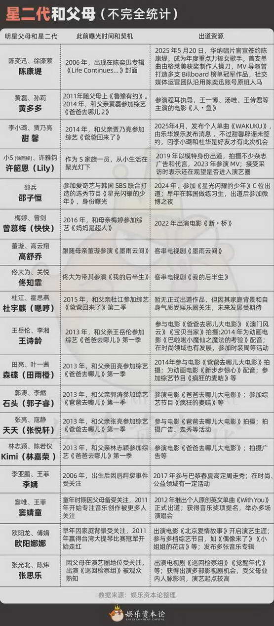 先天的家庭资源就像一条已经铺好的进圈通道。父母的名气、行业人脉和观众基础,让他们节省了许多别人必须经历的 “打怪升级” 过程,也让他们的出现显得 “理所当然”。