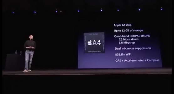 A4 芯片采用 ARM 的 Cortex-A8 内核,频率 1GHz,45nm 工艺生产,性能十分突出,唯一缺点是跟三星的 “蜂鸟 S5PC110” 太像 —— 三星的芯片采用了 Intrinsity 的技术,后者又被苹果收购,导致两颗芯片技术同源。