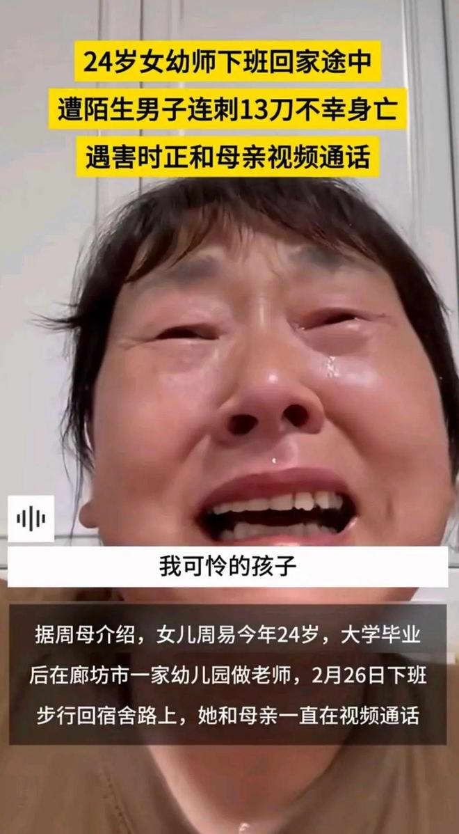河北廊坊,24 岁的幼儿园教师小周被人当街捅了 13 刀。