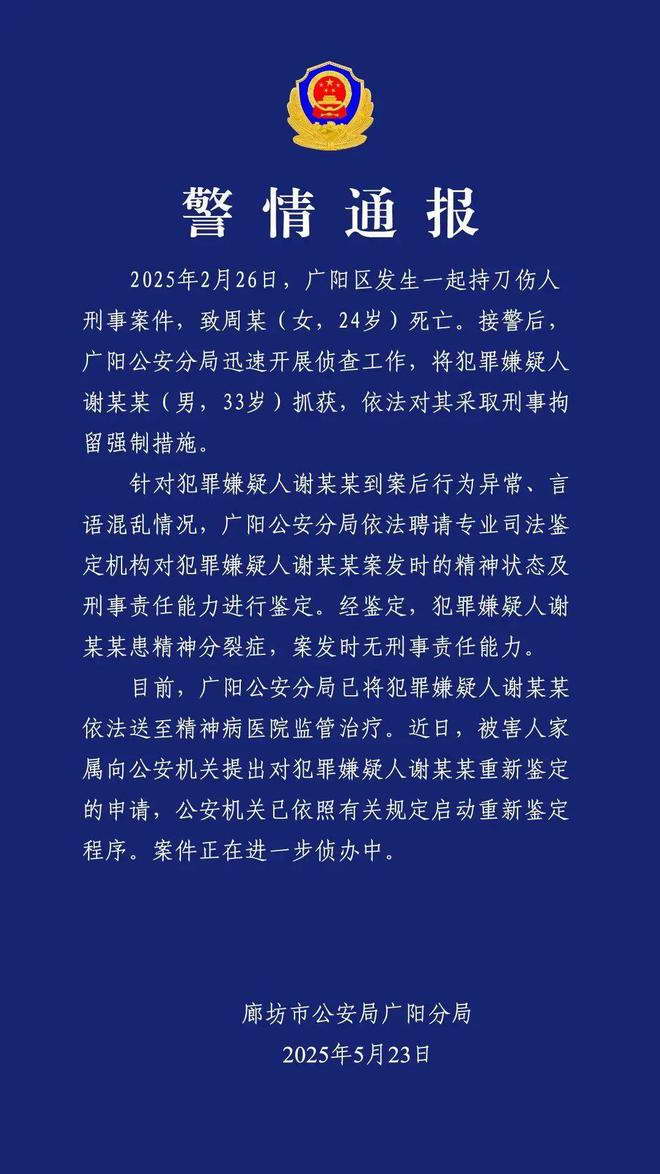 警方初步调查发现,凶手谢某患有精神疾病,判定凶手在案发时无刑事责任能力,现已将其送到精神病医院监管治疗。