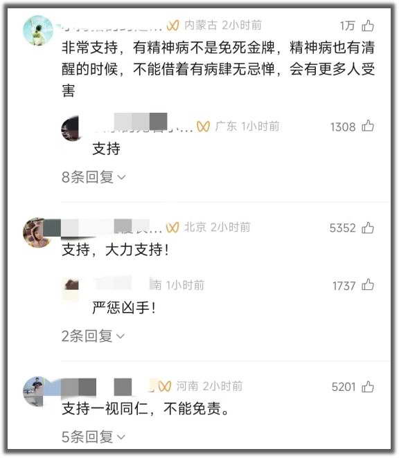还有人呼吁严惩凶手,不能让精神病成为免死金牌。