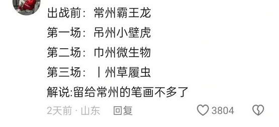 这波常州可被调侃出了天际,出战前是 “常州霸王龙”,第一场变 “吊州小壁虎”,第二场成 “巾州微生物”,第三场直接沦为 “丨州草履虫”。网友直呼:留给常州的笔画不多了。