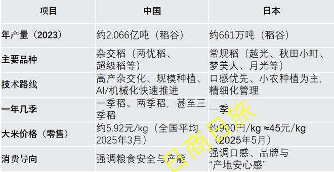 我查了下资料,中国大面积推广的是杂交水稻,日本主要种植的 “越光” 等常规水稻品种,他们认为杂交水稻的口感和品质难以控制。所以日本大米产量远远低于中国,2023 年中国产量为2亿吨,以人口比例看日本应该是 1,780 万吨,实际上却不到 700 万吨。