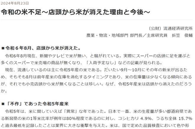 2023 年夏季高温,北海道、青森、秋田等地的农田影响严重,两年连续极端天气,导致水稻广泛歉收 —— 这是绝对的第一理由。我看有人提到产量下滑 30%,为此查了下日本流通経済研究所的报告,虽然没有站在 2025 年解释 2024 年生产量的报告,但是在 2024 年 8 月已经明确提到了: