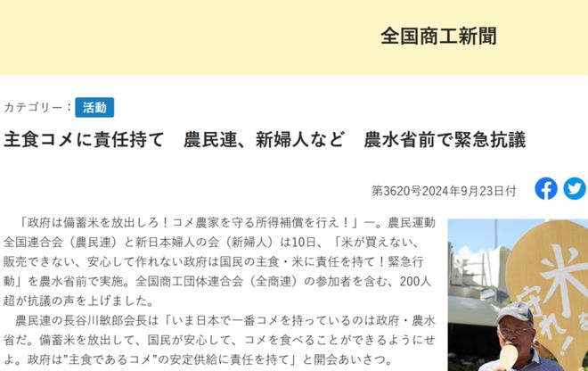 此外,以笔者找到的资料来看,2024 年 9 月,農民連与新日本妇人会的示威活动中,已经提到了呼吁立即释放储备米、为农户提供收入补偿、稳定国内大米供给等诉求。但是距离 2025 年 2 月储备米的发放,又耗了长达半年。