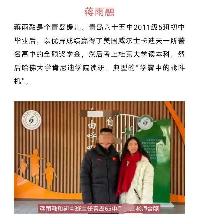 其实最早蒋小姐出来演讲的时候,我看国内网友都是夸奖为主,她母校青岛 65 中还专门有篇文章表示很光荣。