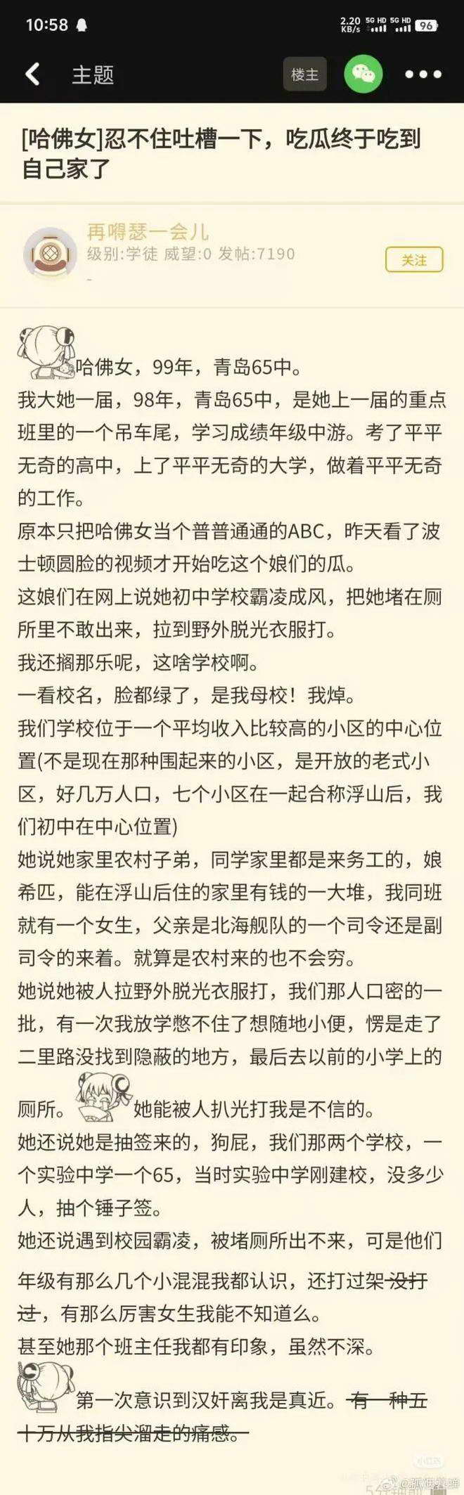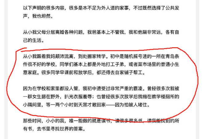 据她自述,从小父母就分居离婚,老爸基本不管她。她和妈妈颠沛流离,初中随机摇号进了青岛某中,这学校条件很不好,同学大多是民工子弟。