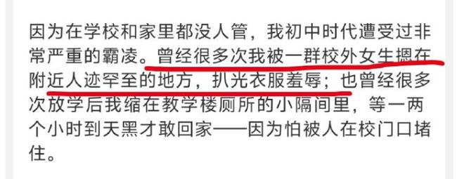 她在初中时代遭受过非常严重的霸凌,曾经?“被一群女生在野外扒光衣服羞辱”。