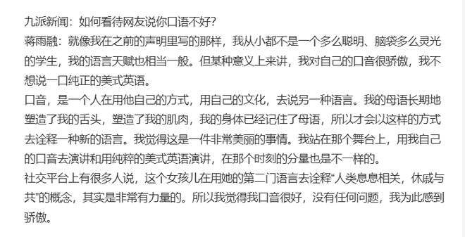 当然,蒋同学也回应了这一点,表示她就是这样的口音,她的口音诠释了?“人类息息相关,休戚与共”?的概念。