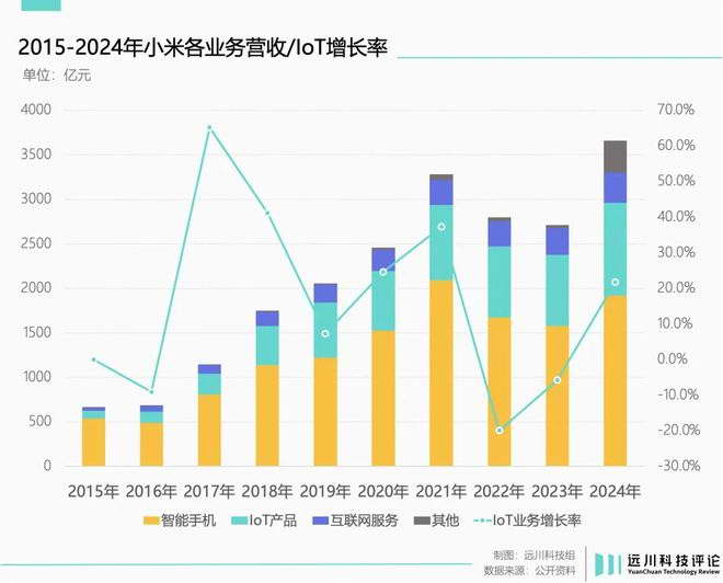 2018 年 - 2024 年,小米 IoT 平台接入设备量从 1.5 亿暴涨至 9 亿。小米自身的 IoT 产品也成为了最大受益者,相同周期内,小米 IoT 业务的营收从 400 亿元增长到了 1040 亿元,几乎复制了一个小米出来。