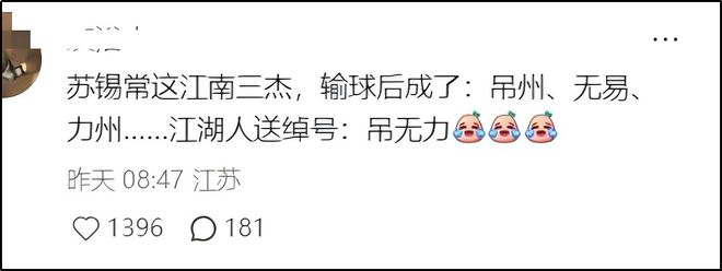 经济发展不错的苏州、无锡、常州反而垫底了。所以网友取出了各种绰号来嘲笑。
