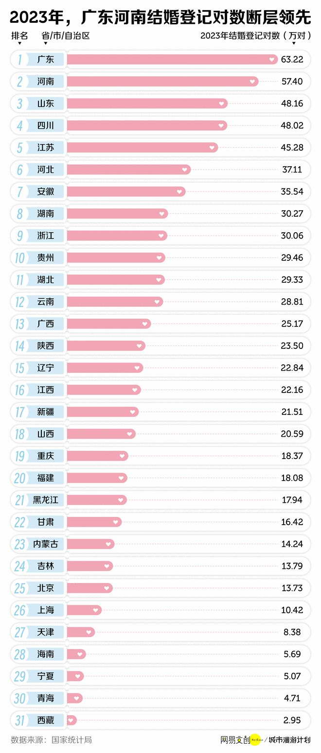 摘得桂冠的是广东,结婚登记对数为 63.22 万,河南则以 57.4 万对的成绩紧随其后。位列第三的山东,登记了不到 50 万对新人,而到第十的贵州,登记量就已经不及广东的一半了 [3]。