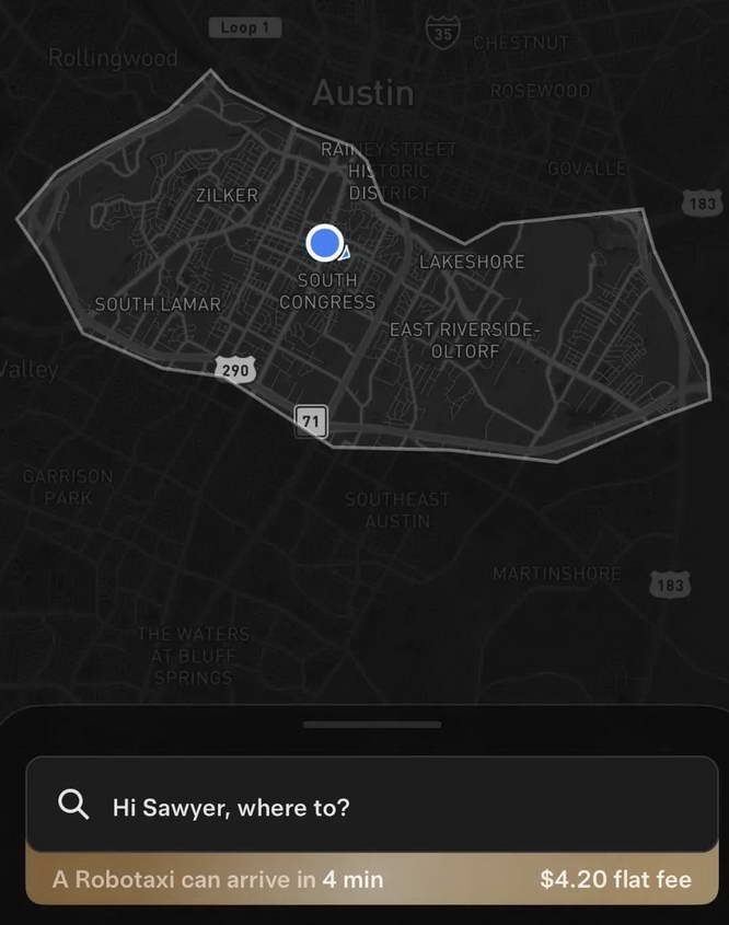 在下载到 Robotaxi 应用后,梅里特发布了一张图片,介绍了特斯拉 Robotaxi 的服务区域。该地图似乎覆盖了一个面积较小的区域,北至科罗拉多河,东至 183 号高速公路,南至 290 号和 71 号高速公路,西至齐尔克公园。