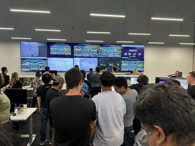 特斯拉自动驾驶团队负责人阿肖克?埃卢斯瓦米 (Ashok Elluswamy) 发布了一张照片,显示一个房间里有数十人,墙上挂着 10 块大显示屏,播放着多辆 Robotaxi 的实时车载画面。他写道:“Robotaxi 首发派对。”