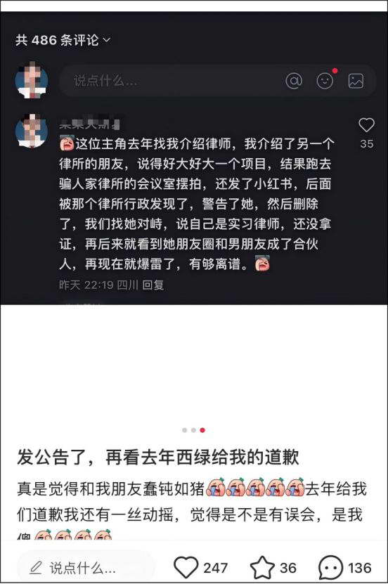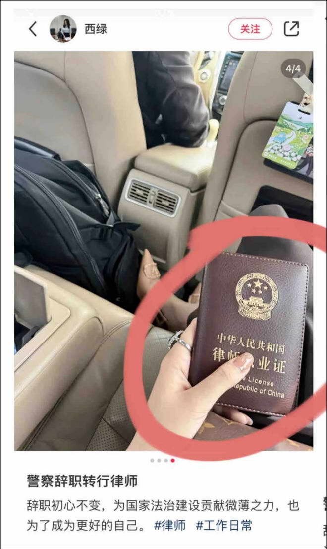 有网友爆料过,去年她说有一个合作的大项目,结果就是去人家律所一顿摆拍发小红书。被发现后她说自己是实习律师,还没拿证。