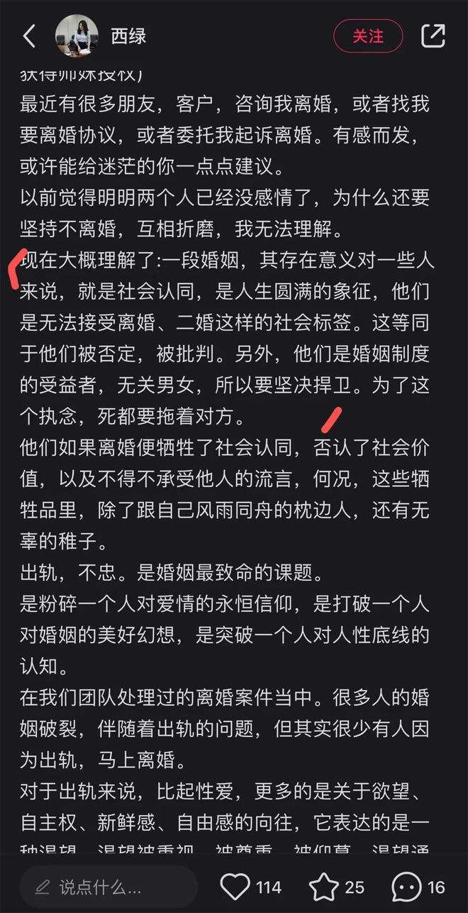 所以你都没有看到她讲过一次专业性问题,反而只喜欢输出概念性阐述,比如离婚出轨那段。