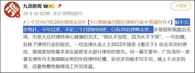 几个月前,九派新闻统计了一下:“据不完全统计,今年以来,不足三个月的时间里,已有 20 名律师去世。”