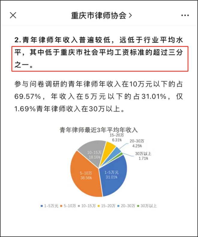 去年重庆市律师协会一份调研报告显示,重庆有三分之一的青年律师收入低于当地社平工资标准。