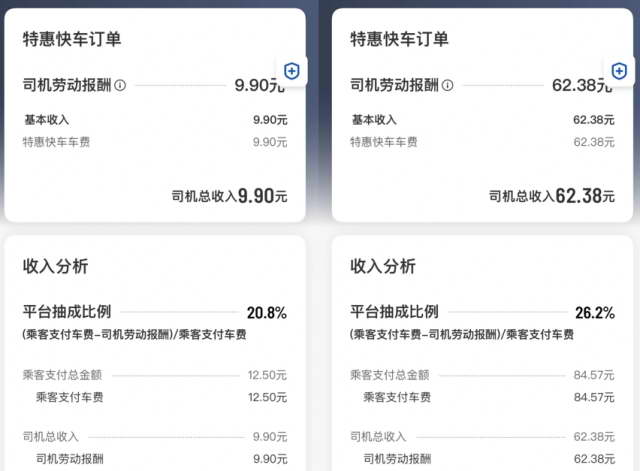特惠单占比大,赚得少。这几位杭州司机大都表示,特惠的平均收入在一块二一公里,而快车收入则是平均一块六上下。