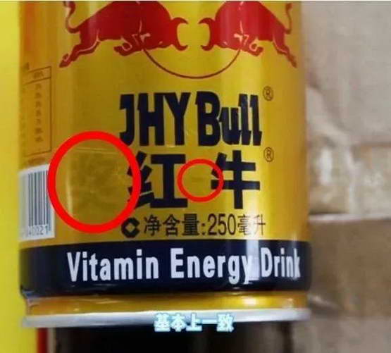 去年初,重庆警方就打垮了一家生产名为 “JHY Bull” 能量饮料的窝点 [6],仔细端详,会发现 “红牛” 两个字旁边还有颜色与罐体融为一体的 “奖一” 二字,有种零添加牌酱油的美感。
