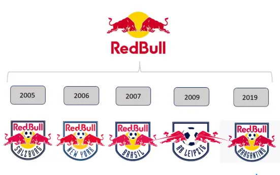 2009 年,红牛收购德国球队马克兰施塔特,由于德国足协限制赞助商冠名俱乐部,球队不能直接叫 “红牛”。但这显然难不倒身经百战的红牛,收购完成后,球队改名?RasenBallsport Leipzig E.V(莱比锡草地球类运动协会),简称 RB 莱比锡。球队 Logo 也是教科书级的打擦边球。