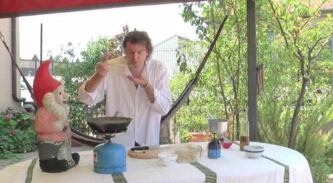 随后,他又推出了一个短命的送餐服务,一个介绍有机食品益处的博客。虔诚的朝圣者,能找到他 2009 年的一个视频 —— 德瓦西尼身穿宽松的白衬衫,在自家阳台上,桌上摆上一个怪异的大型小矮人,做荨麻烩饭(nettle risotto)。注②