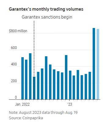 当然,美国也很快发现 Garantex,启动制裁。但是 Garantex 不惧,直接抛弃所有在美国的资产,把公司运营需要的设备全部转移到 “中立司法管辖区”,也就是美国管不到的地方。然后疯狂发展业务。