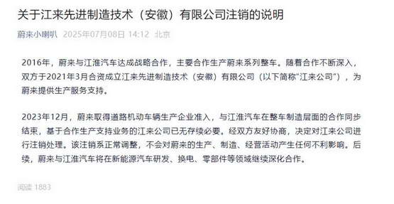 蔚来这边的说法是 “正常调整”,不会对蔚来产生不利影响。后续还跟江淮汽车将在新能源汽车研发、换电、零部件等领域深化合作。就比如江淮也有兼容蔚来换电的车型,然后乐道还有一些零部件靠江淮供应啥的。