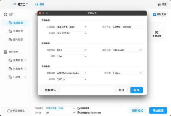 把码率调到最低,再把数千万的色彩砍到 256,这时视频虽然会抽象起来,但体积也会减少很多。