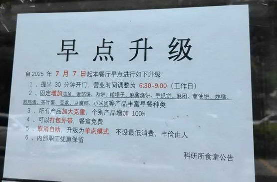 更重要的是,不少善于经营的食堂,除了做好每日的餐食,也会不断汲取社会餐饮的经验,把体验感拉满,让餐厅不断升级。比如卫健委食堂,从 7 月初开始升级早餐,在门口张贴的告示中明确提出 —— 丰富餐品、加大克重、提早开门迎客,餐盒还免费。这些特点,直击顾客的心,每一个都是 “加分项”,让人难以拒绝。