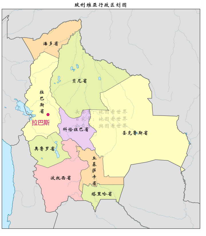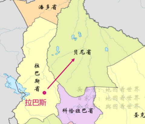 从地图可以看到,首都拉巴斯所在的拉巴斯省和东北角的贝尼省是接壤的,如果要从拉巴斯去贝尼省,直线距离非常近: