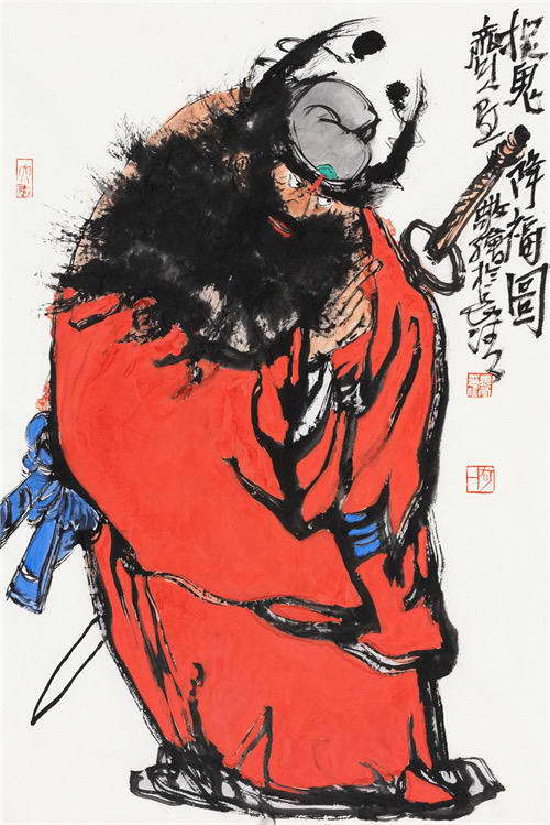 钟馗的坐骑也充满说法。在一些文人画中,钟馗骑着一头小毛驴,悠然自得,更显其世俗化、近人情的一面,仿佛一位巡游人间的 “谪仙”;而在另一些作品,尤其是强调其镇宅神威的场合,他的坐骑则换成了猛虎,象征其无可匹敌的降魔之力。