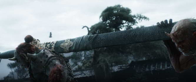 理解了这层层递进的文化渊源,再来看《黑神话:钟馗》的 PV,便能略微体会一下游科的选择:在这个 “仅有” 1 分 55 秒的 PV 里,开篇是两个窃窃私语的随从营造出诡秘的氛围,“大王” 等词开始出现,随后,镜头转向角落之外,先出现的并非钟馗本人,而是两位抬着巨剑、身形魁梧的侍从(其形象酷似妖物,一度让期待 DLC 的观众联想到了《悟空》中的狮驼岭)—— 直到镜头上移,我们才看到身骑猛虎、威严而坐的钟馗本人。