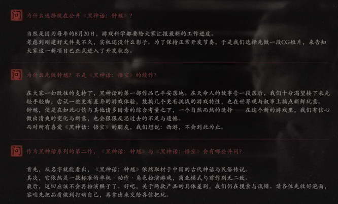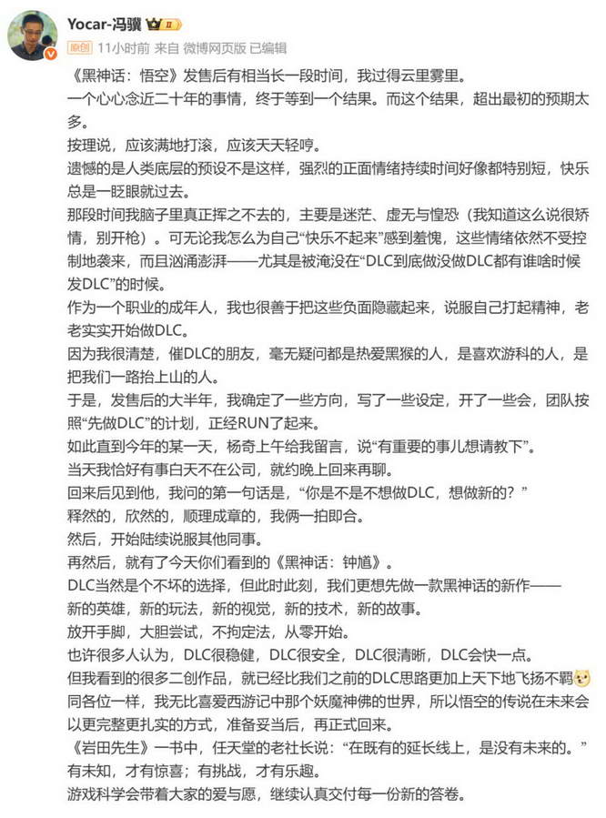 对于这个问题,在 PV 释放的第一时间,游戏科学联合创始人、《黑神话:悟空》制作人冯骥在官网发布了一篇长文,给出了相当坦诚的回答。